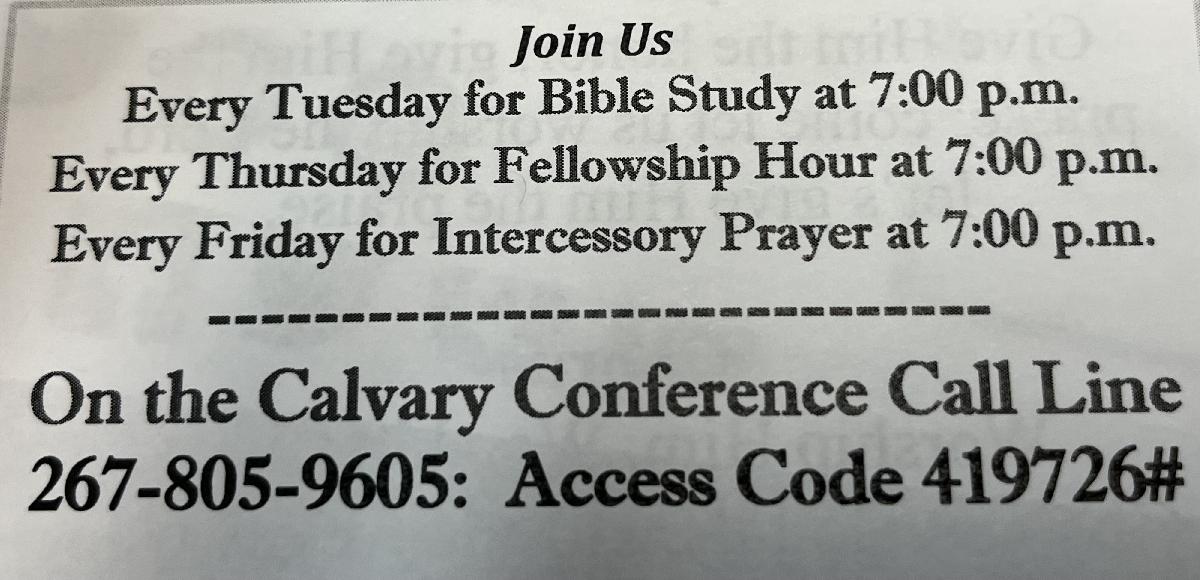 Join us for in-person worship, or on our new streaming platform, Facebook Live, YouTube, Twitter, Instagram and on the Conference Call line. Dial 267-807-9605: Access Code 419726#. Worship time is 10:00 am. If you are worshipping in person, please arrive between 9:30-9:50am for registration.